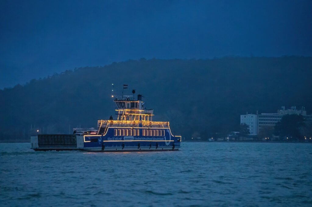 Ünnepi fényekbe burkolózó komppal hajózhatsz a Balatonon december 6.-ától minden nap reggel 7 és 8 óra között, valamint délután 16 óra után Tihany és Szántód között.