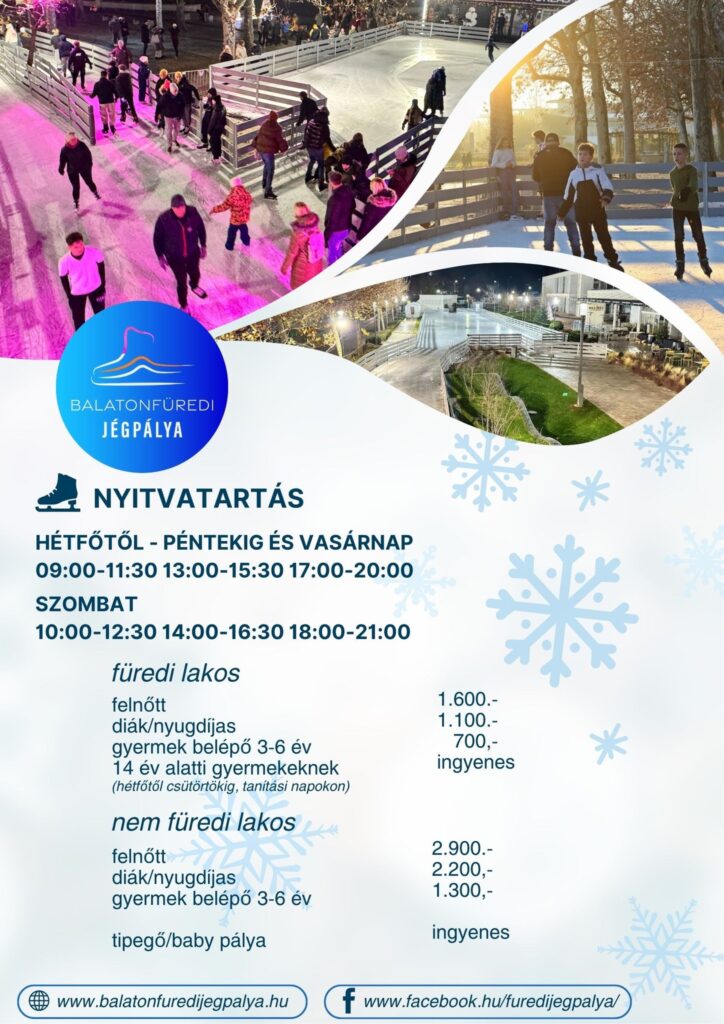 A pálya nyitvatartását és a belépő díjait megtalálod a képen, illetve a szervezők hivatalos oldalán az alábbi linken: https://balatonfuredijegpalya.hu/hirek/