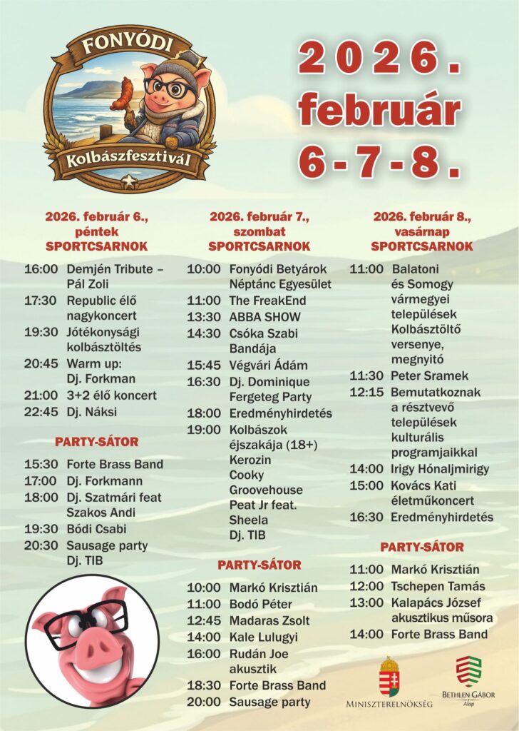 Lesz itt mindenféle disznóság mi szem szájnak ingere. Kocsonya, hurka, kolbász, hagyományos disznótoros ételek. Szombaton 12 órától élő kolbásztöltést is figyelemmel lehet kísérni. A finomságok mellett élőzene, néptánc előadás, gyerekprogram, retro diszkó is gondoskodik a jó hangulatról.