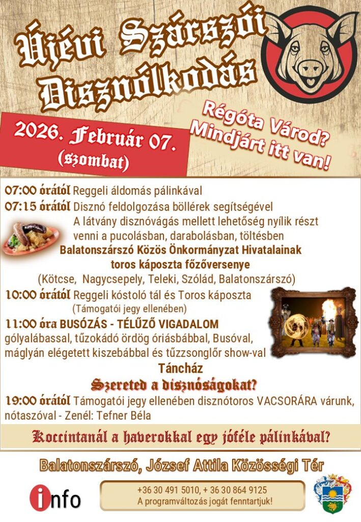 Balatonszárszón a József Attila Közösség Tér reggel 7 órától áldomás pálinkával veszi kezdetét az Újévi Szárszói Disznólkodás.