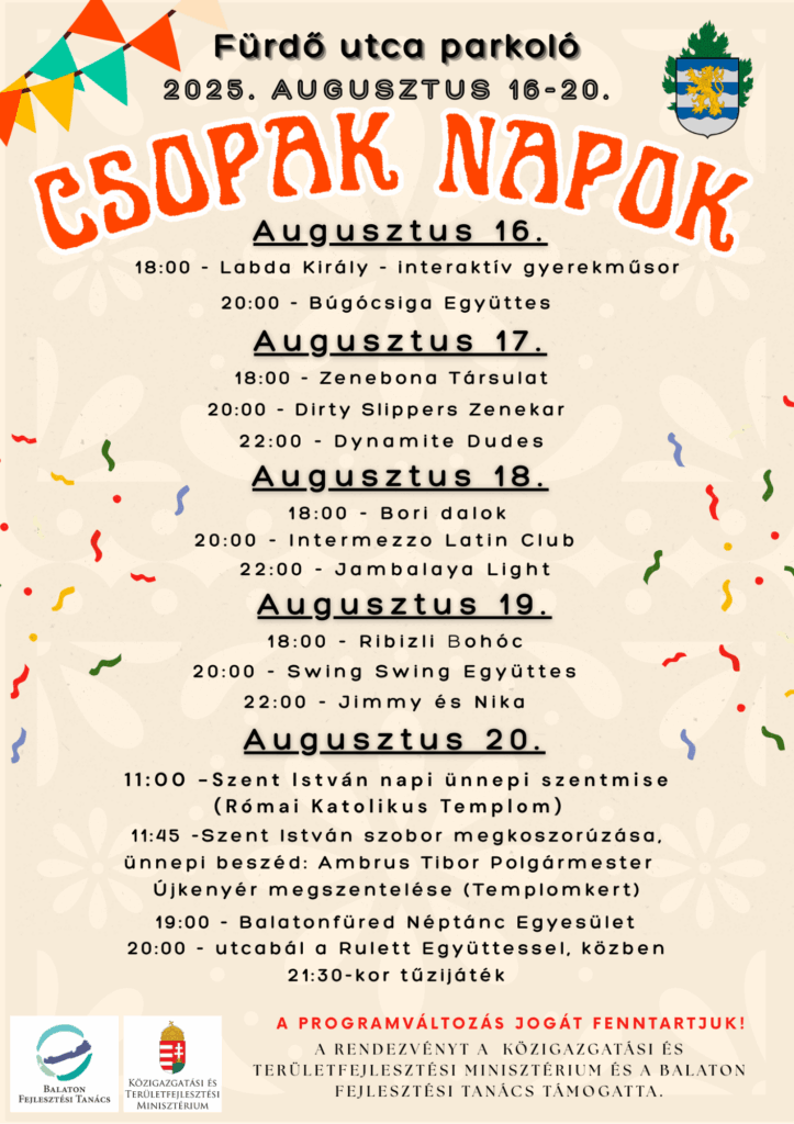 Augusztus 16.-ától várnak mindenkit szeretettel aki szeretné az esti balatoni hangulatot koncertekkel színesíteni. Augusztus 20.-án a Római Katolikus Templomban szentmisével, koszorúzással, a polgármester úr ünnepi beszédével, az újkenyér megszentelésével, néptánc bemutatóval, utcabállal és természetesen tűzijátékkal is várnak a szervezők.