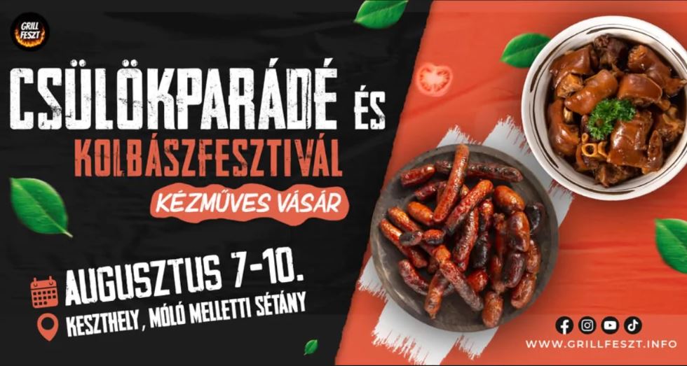 Keszthelyen a móló melletti sétányt négy napon kereszt a csülök és a sült kolbász illata fogja belengni. Augusztus 7.-én 17 órakor az ünnepélyes megnyitóval kezdődnek a programok. Lesznek koncertek, DJ bulik, édességkereső verseny, alkoholkedvelők versenye és persze a finom csülkök és kolbászok. Az eseményről részletes tájékoztatást az alábbi linken találsz: https://keszthely.hu/programok/csulokprarade-es-kolbaszfesztival-kezmuves-vasar/